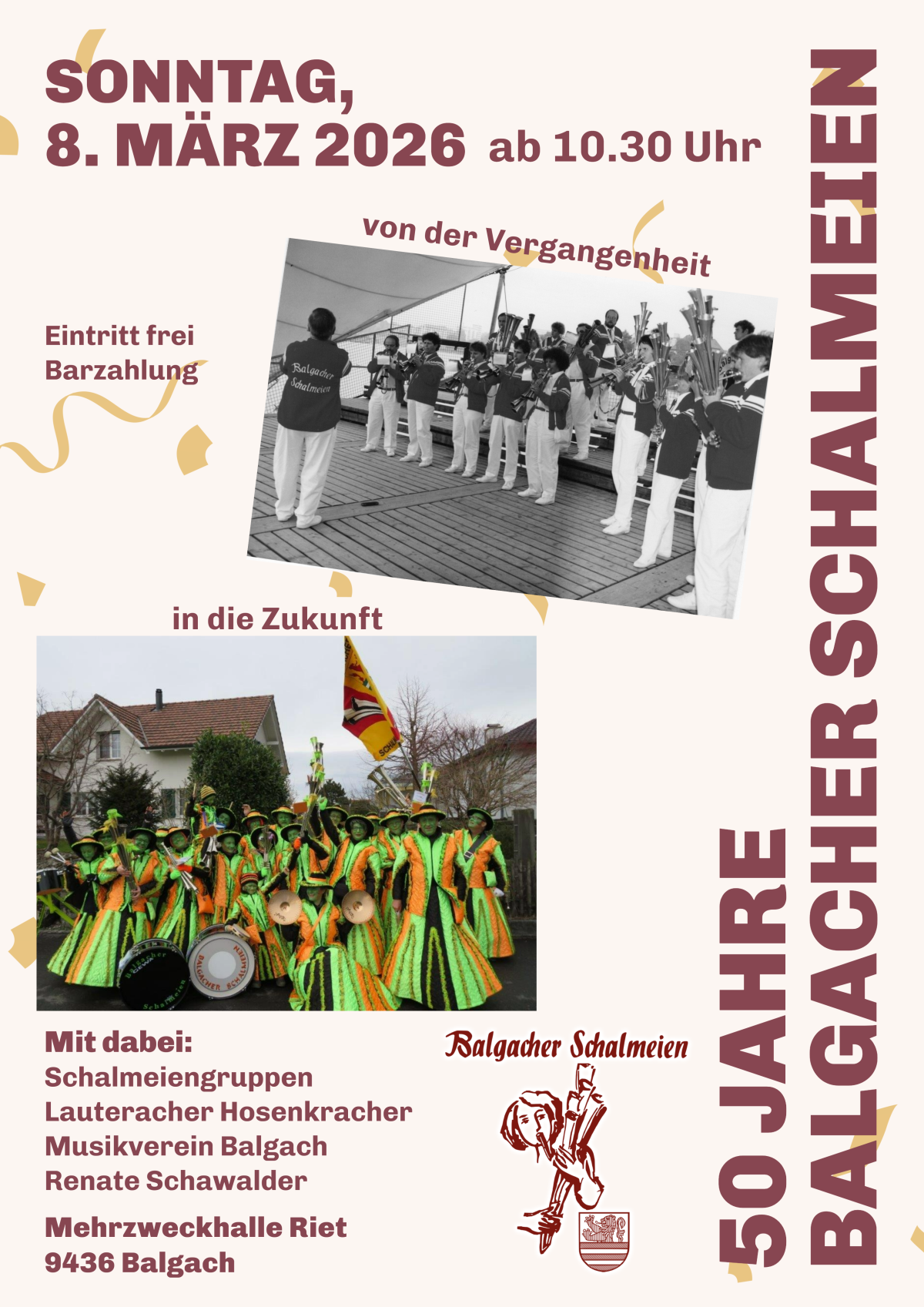 Am 8. März 2026 werden wir unser Jubiläum in der Mehrzweckhalle Riet in Balgach mit einem tollen Rahmenprogramm feiern!